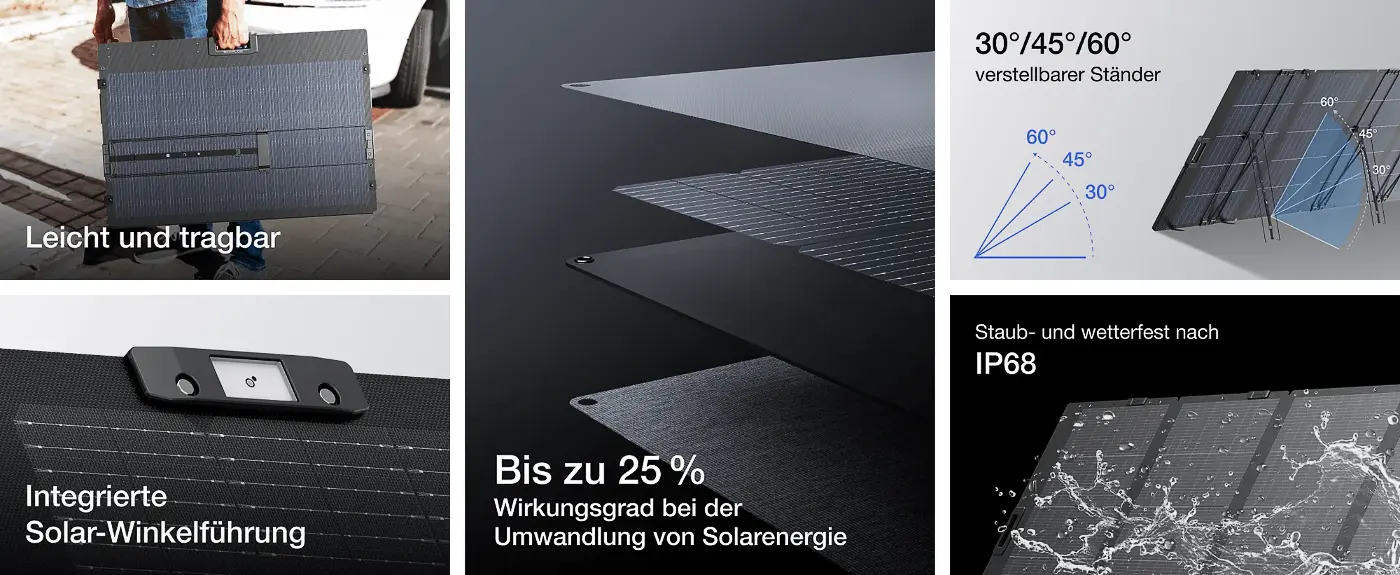 Der integrierte, faltbare Ständer ermöglicht drei Neigungswinkel (30°, 45° und 60°) – ideal für unterschiedliche Sonnenstände und Breitengrade. Eine integrierte Solar-Winkelführung hilft dir, das Panel optimal zur Sonne auszurichten und so jederzeit die maximale Leistung zu erzielen.