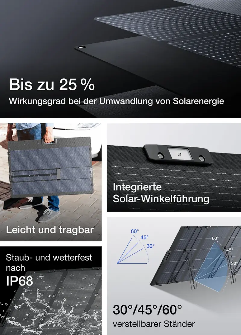 Mit einem Gewicht von nur rund 5,8 kg weniger als Vorgängermodelle bietet das 400 W Panel höchste Tragbarkeit und lässt sich leicht transportieren oder verstauen – perfekt für Camping, Reisen und flexible Energieversorgung unterwegs.